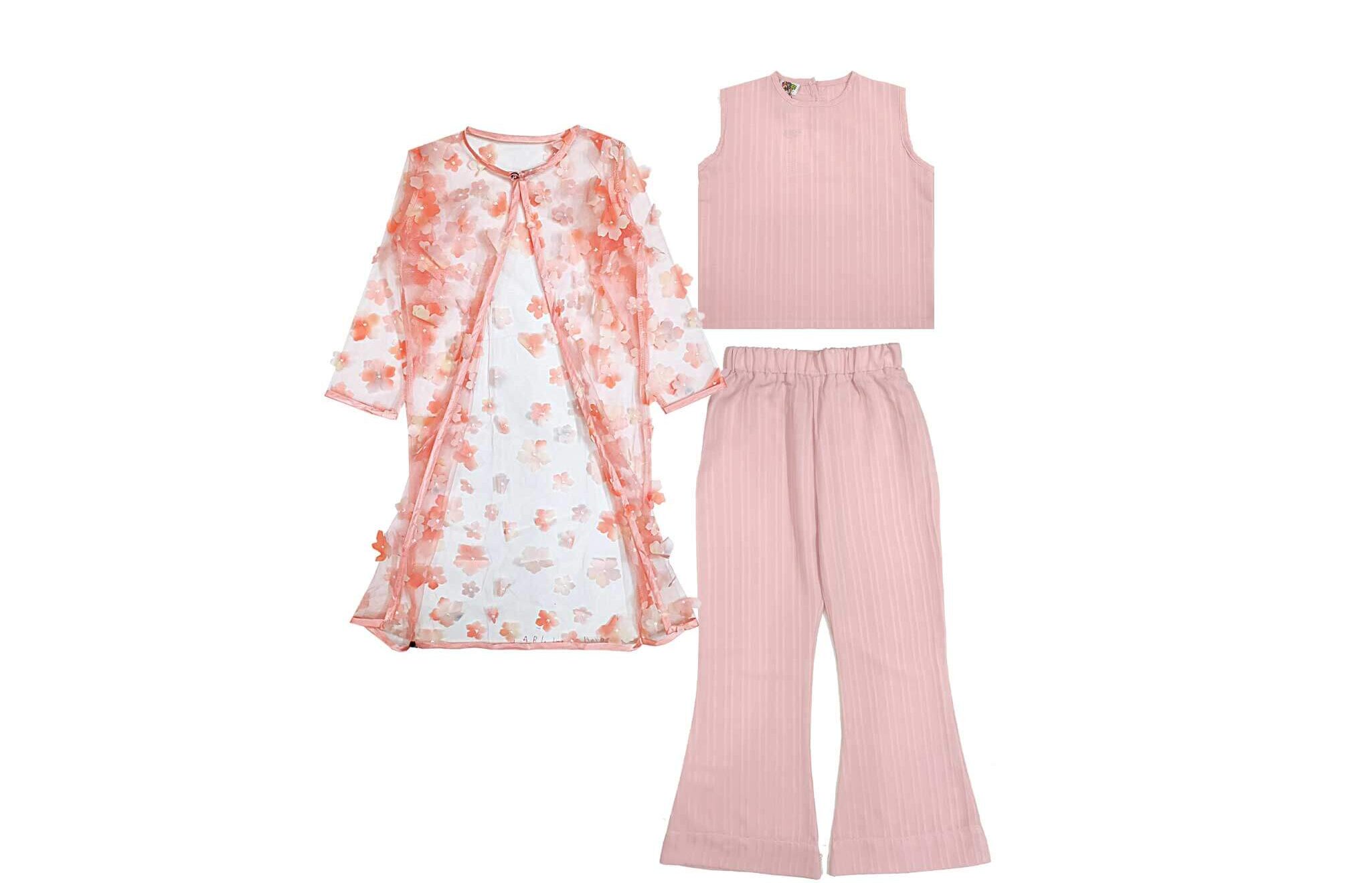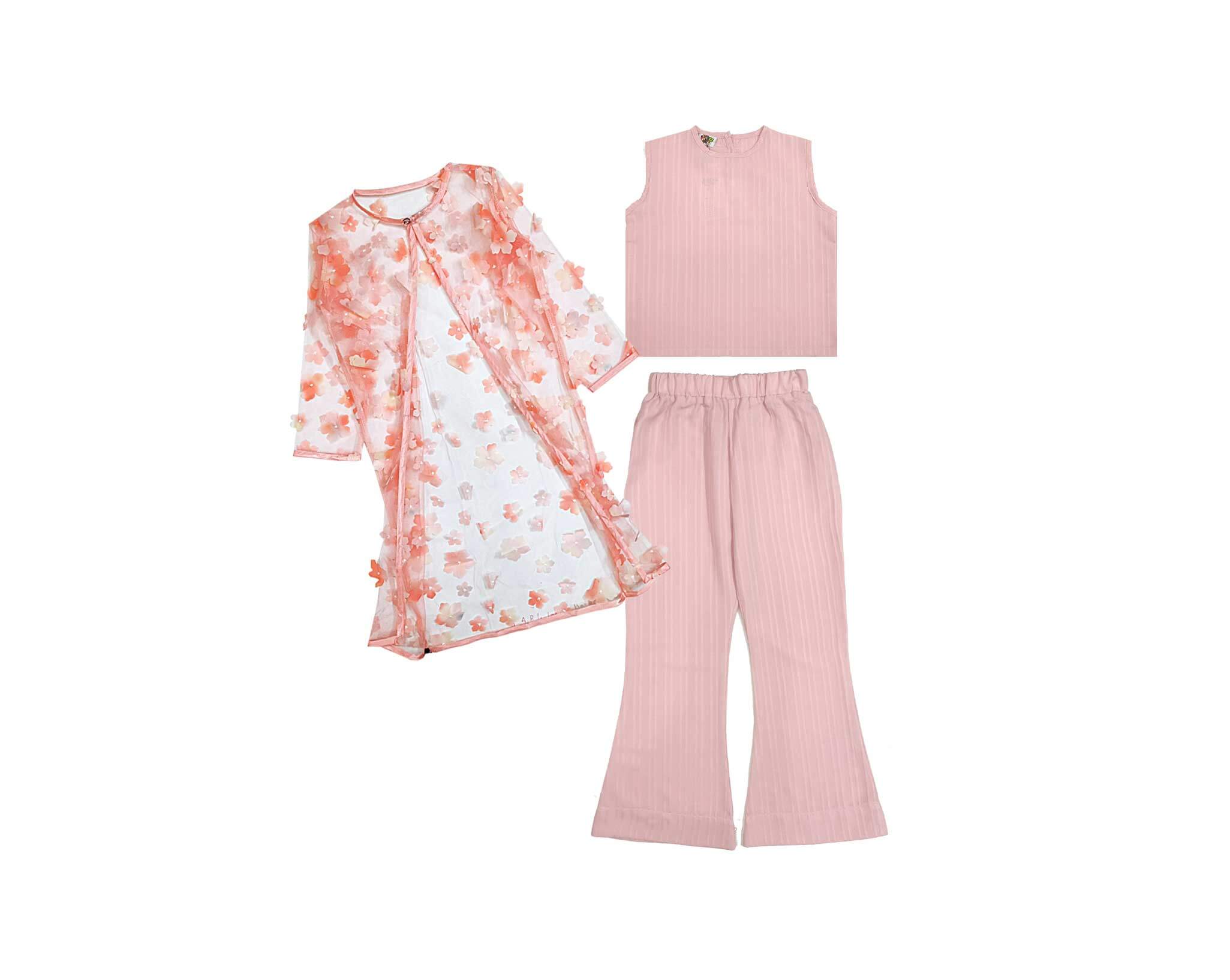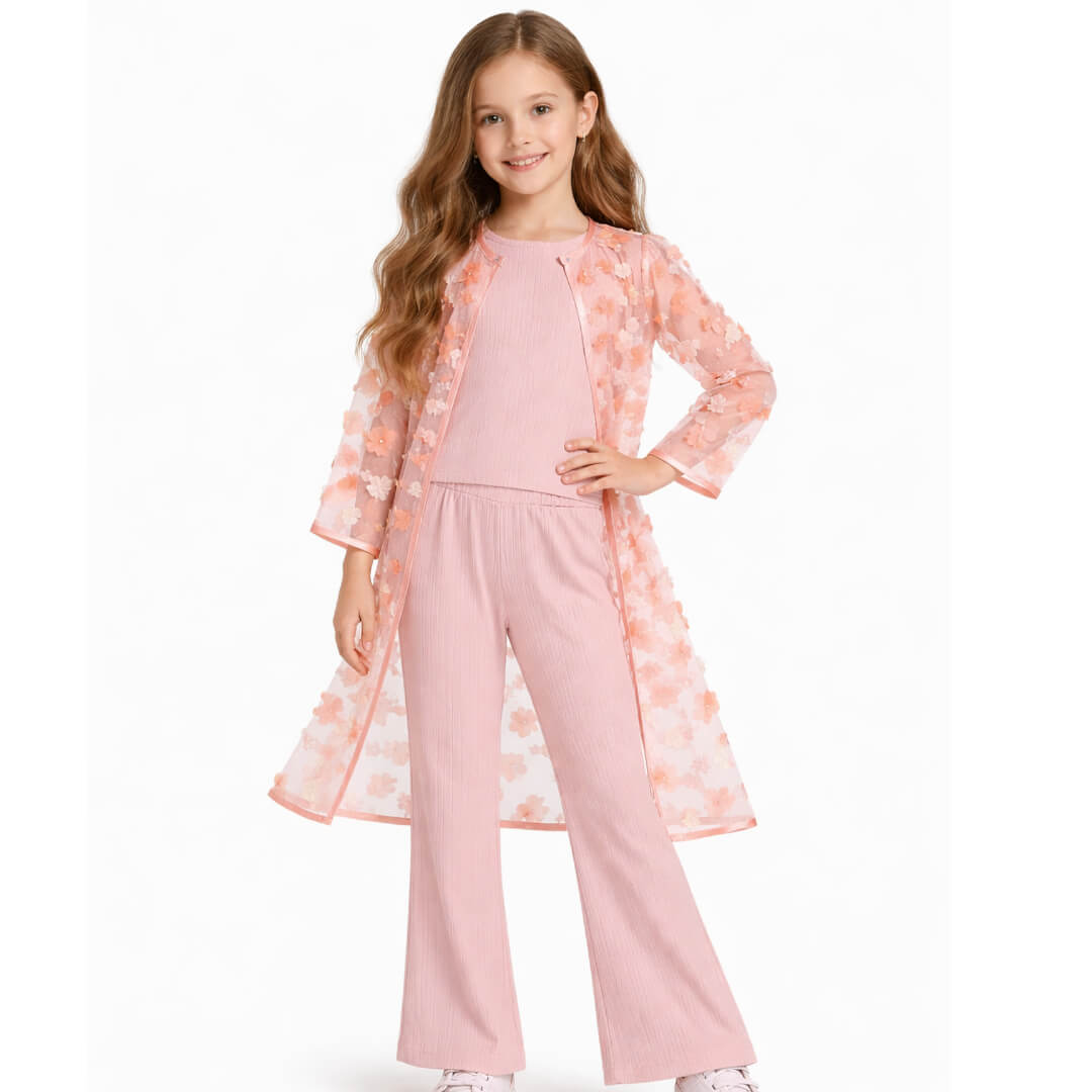 3d Flowers Net Top with Flared Pants & Shrug Set Pink