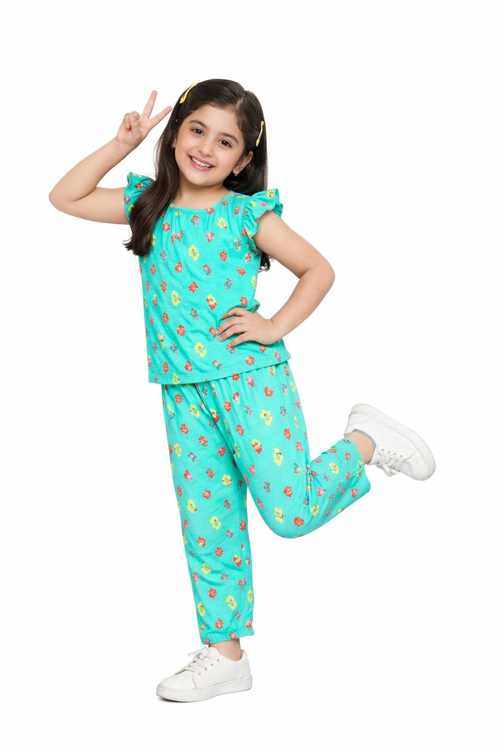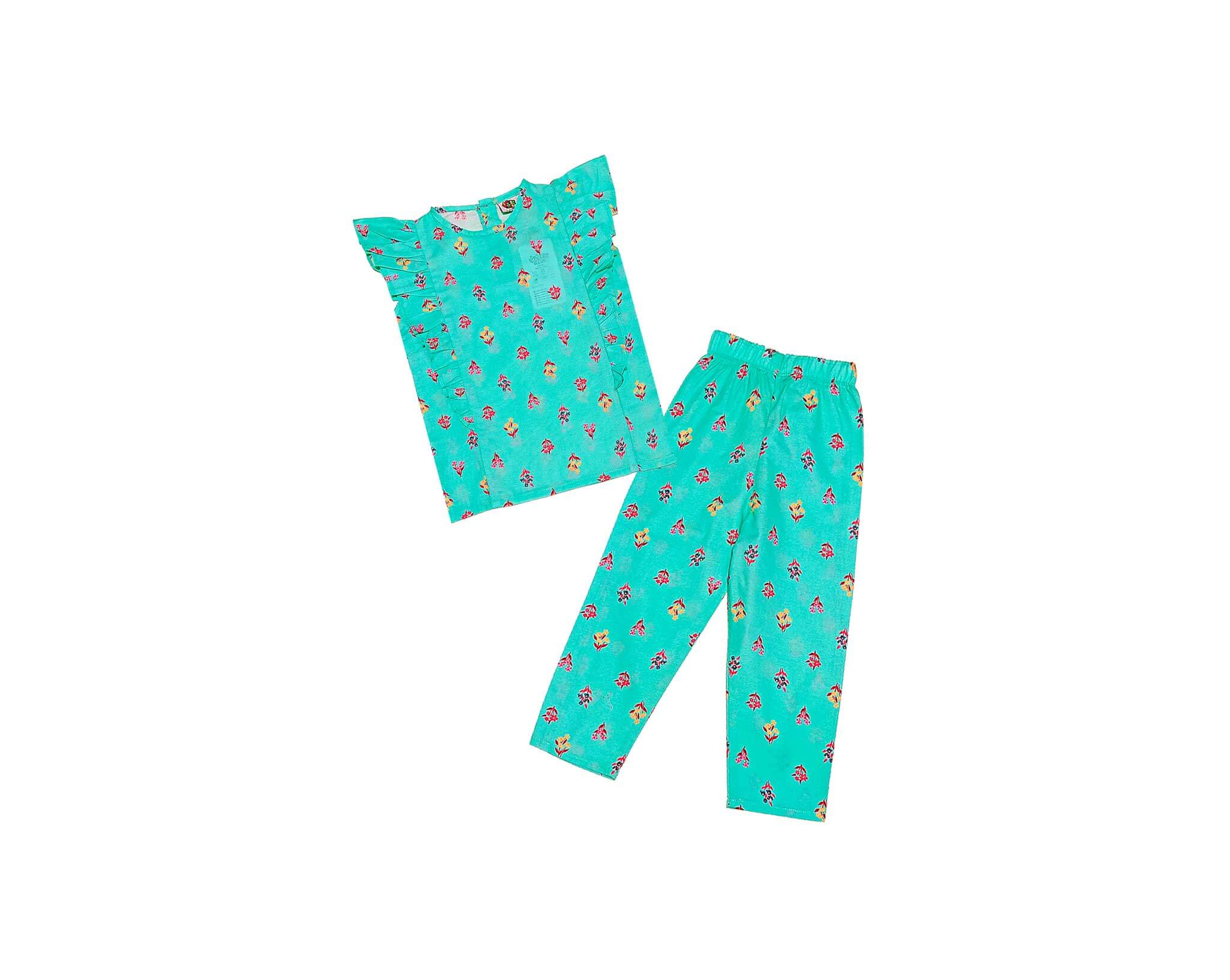 Baby Flowers Frill Stylish Cotton Top & Trouser – Sea Green
