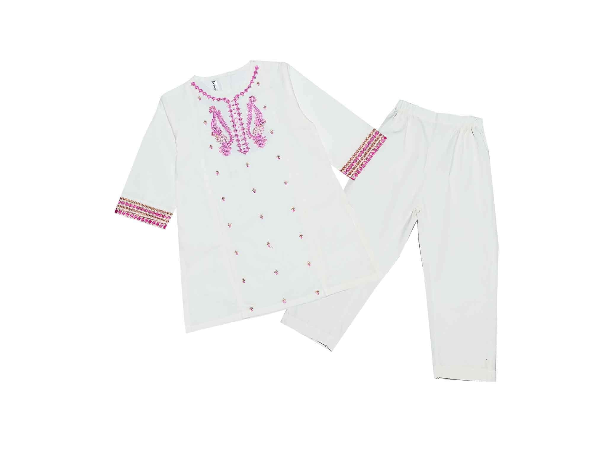 This two-piece cotton-rich outfit is perfect for summer days. It includes Baby Pink Trendy Embroidery Cotton Shirt & Trouser White