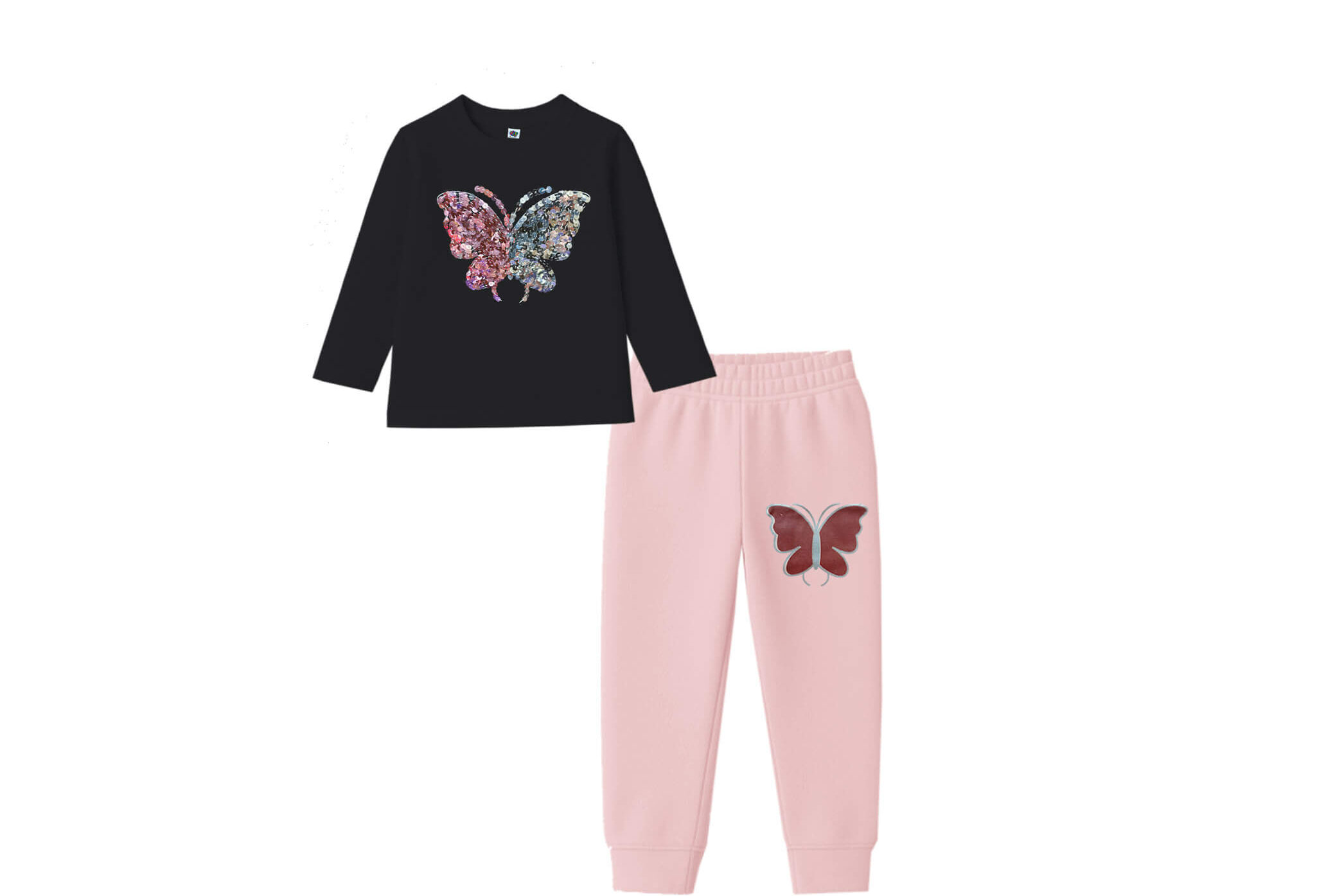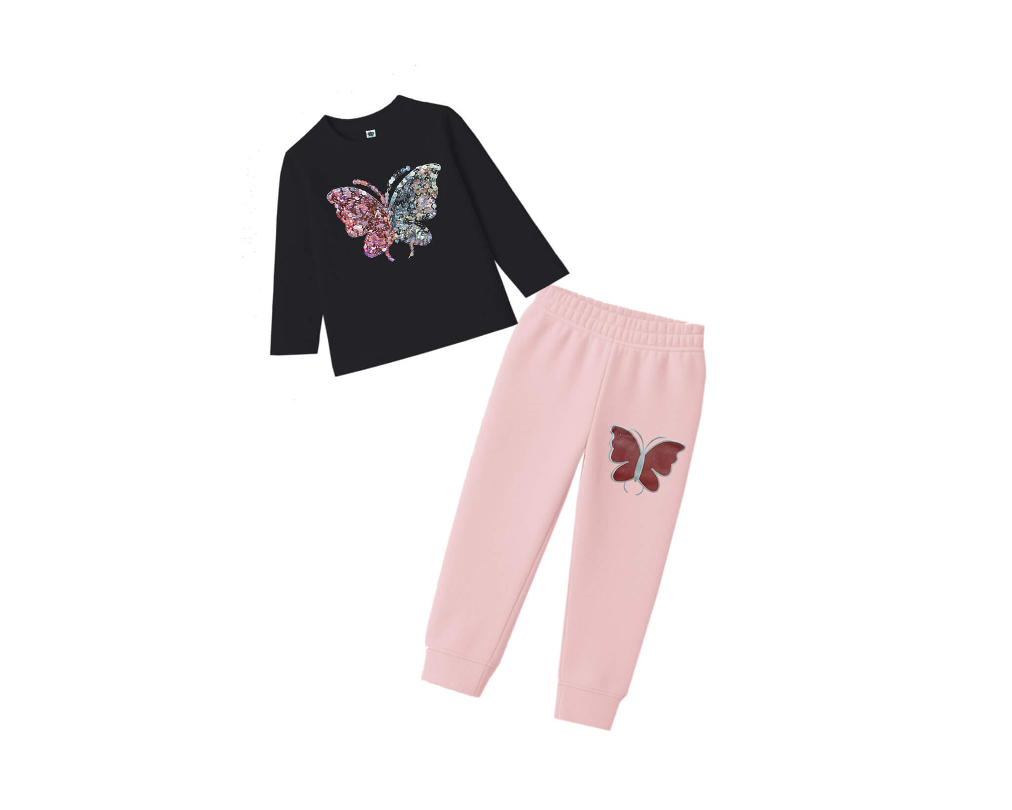 Colorful Sequin Butterfly Full Sleeves Tee & Trouser – Black & Peach