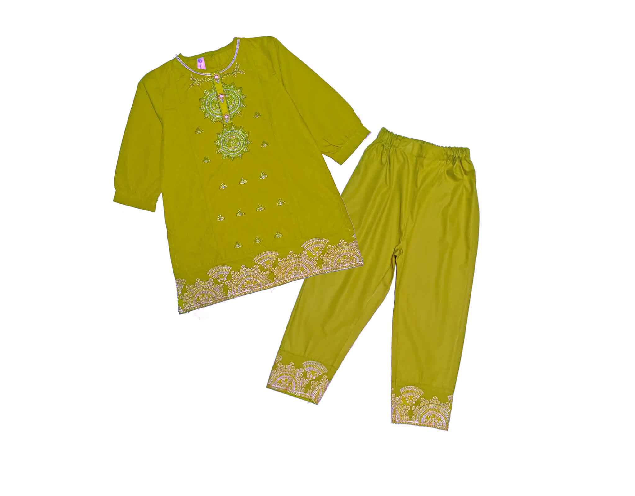 Contrast Embroidered & Tella Cotton Kameez & Trouser – Olive Green