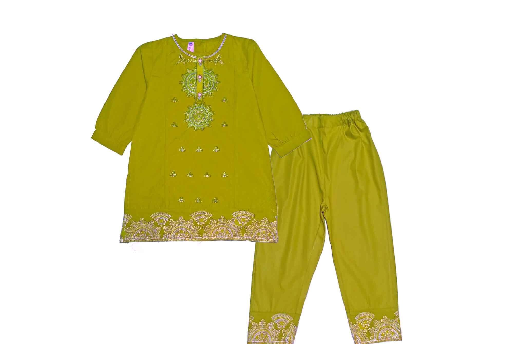 This two-piece cotton-rich outfit is perfect for summer days. It includes Green, White Trendy Embroidery Cotton Shirt & Trouser Olive Green