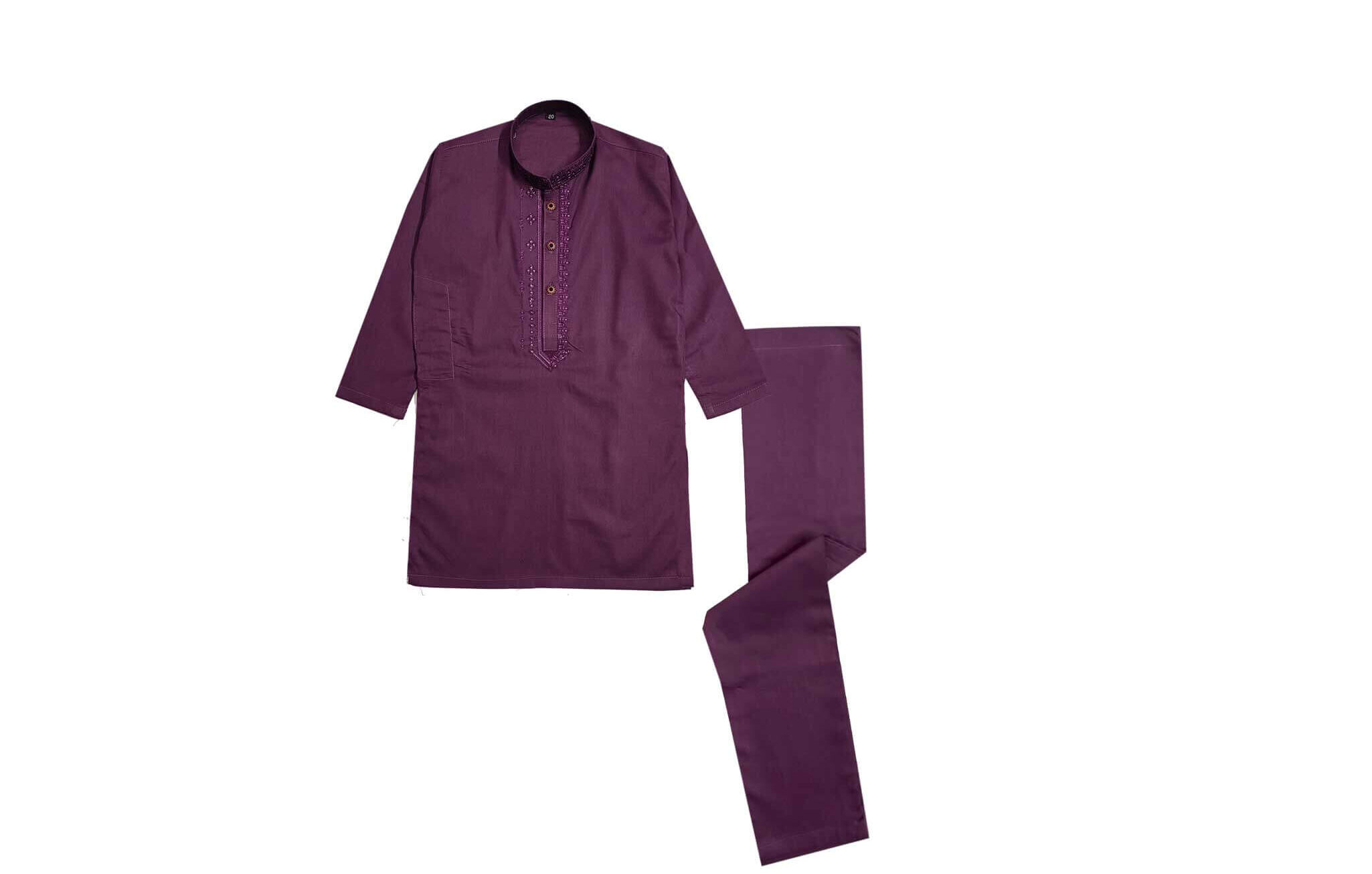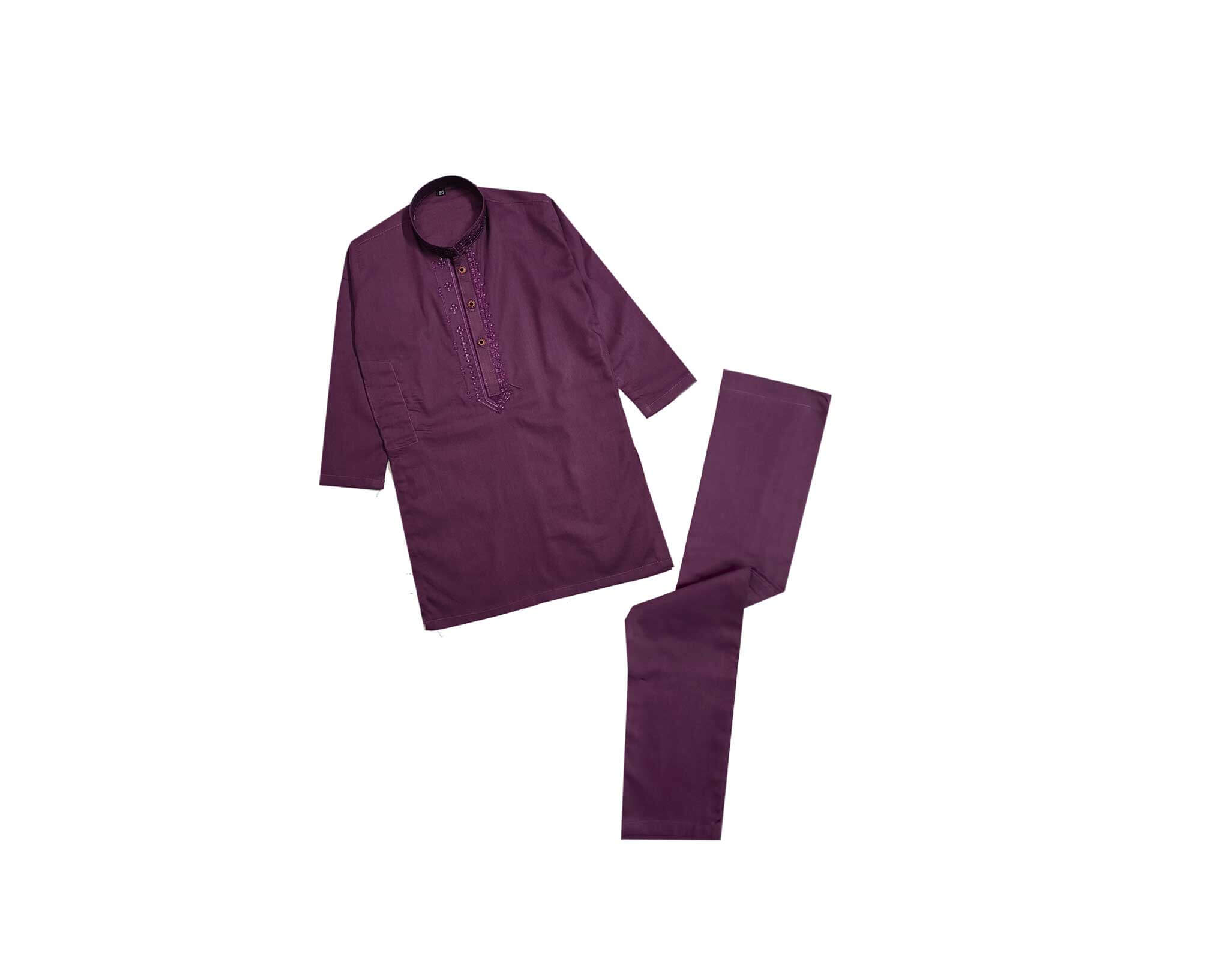 This is a traditional Shalwar Kameez set in a beautiful emerald maroon color designed for Kids. The set includes a matching shirt (kameez) and trousers (shalwar).