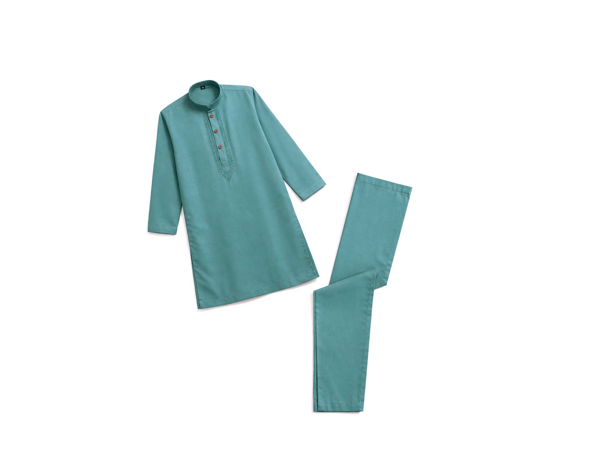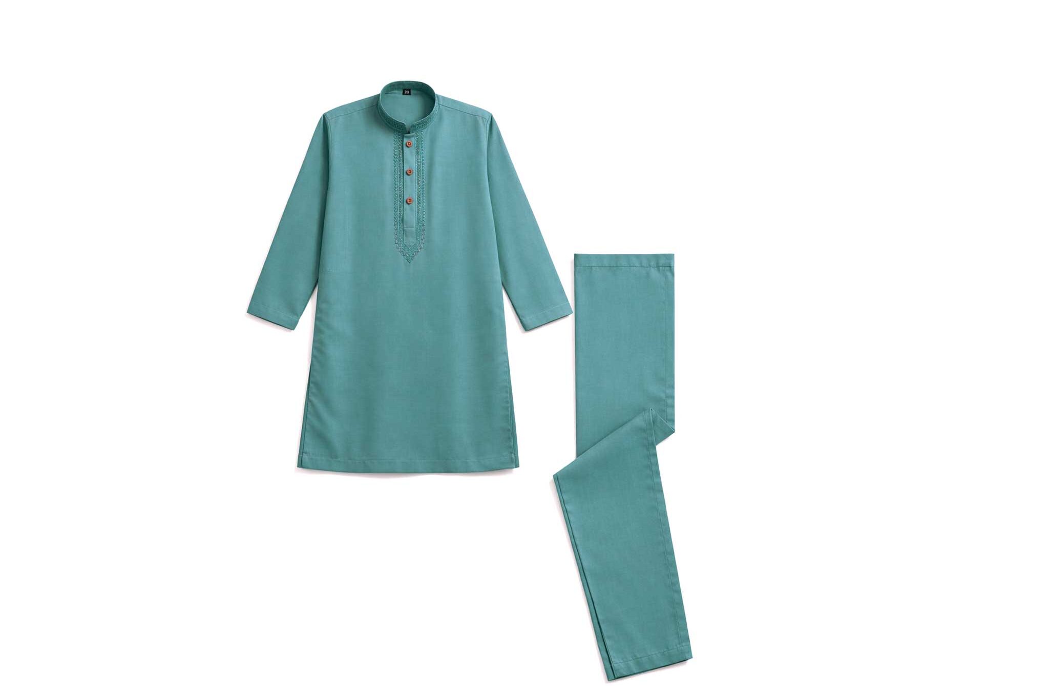 This is a traditional Shalwar Kameez set in a beautiful emerald off white color designed for Kids. The set includes a matching shirt (kameez) and trousers (shalwar).