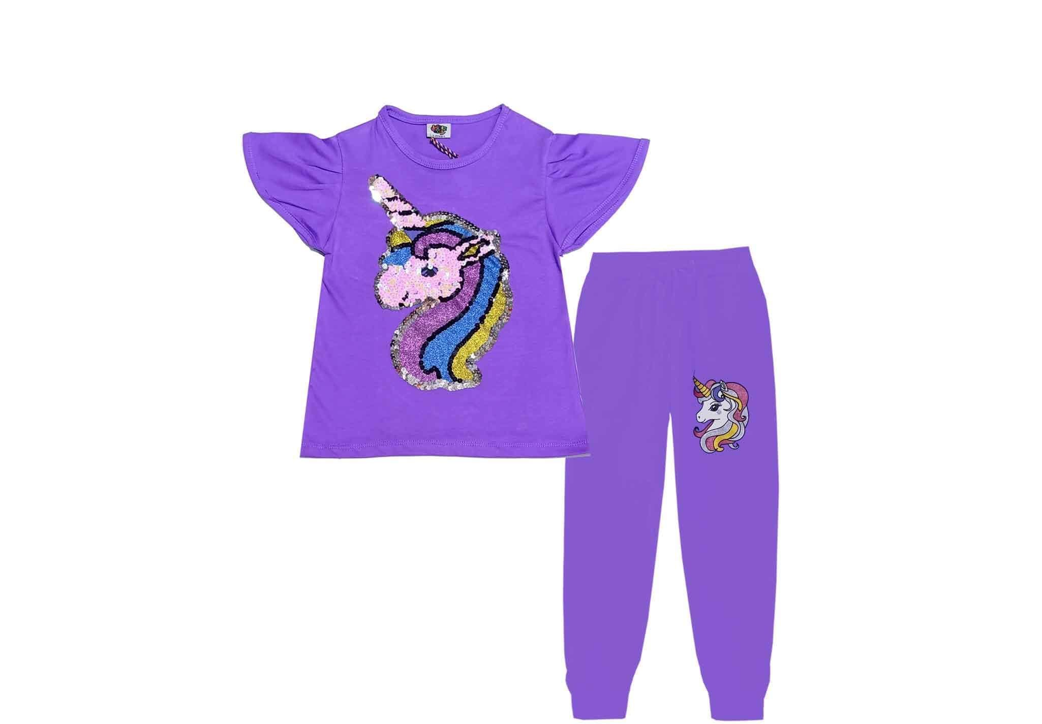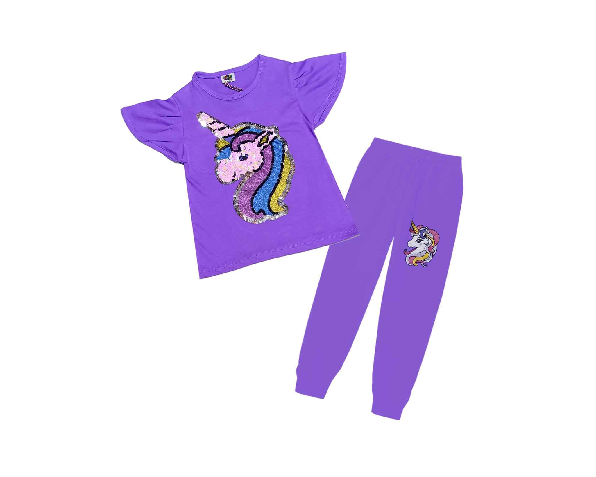 Multi Colors Glitter & Sequins Unicorn Fish Cut Sleeves Tee & Trouser – Purple