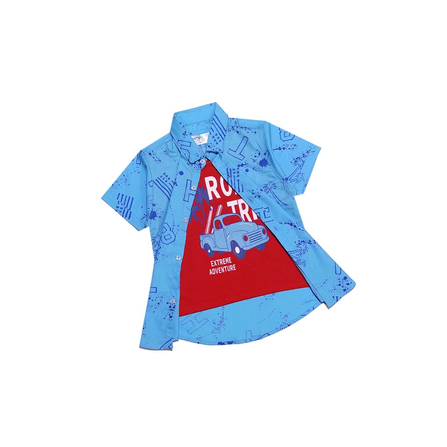 Road Trip Car Twofer Cotton Casual Shirt – Sky Blue & Red