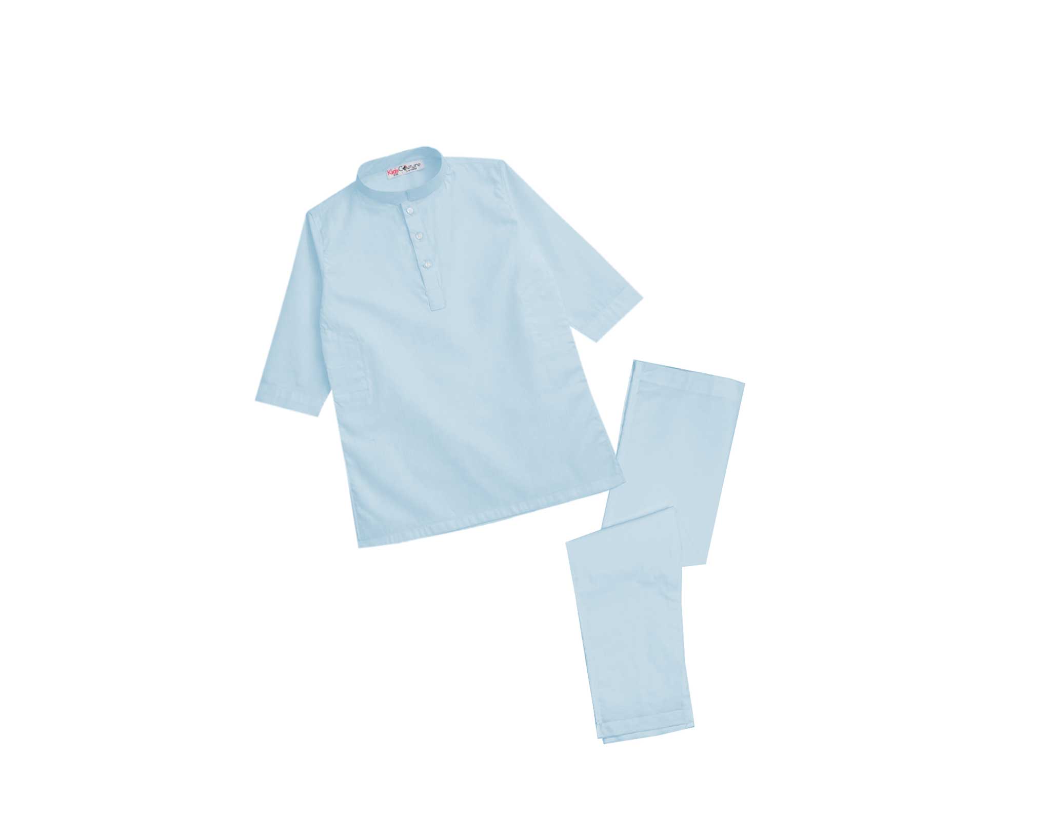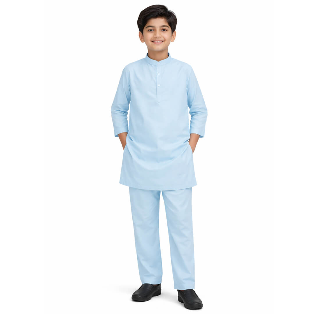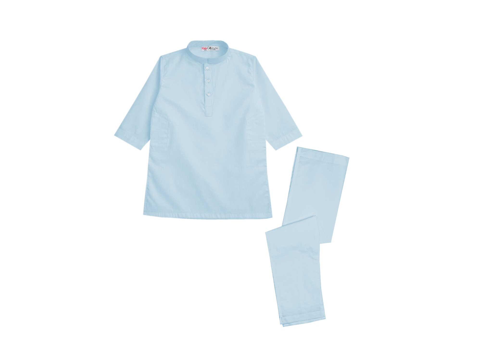This is a traditional Shalwar Kameez set in a beautiful emerald Sky Blue color designed for Kids. The set includes a Sky Blue shirt (kameez) and Sky Bluetrousers (shalwar).
