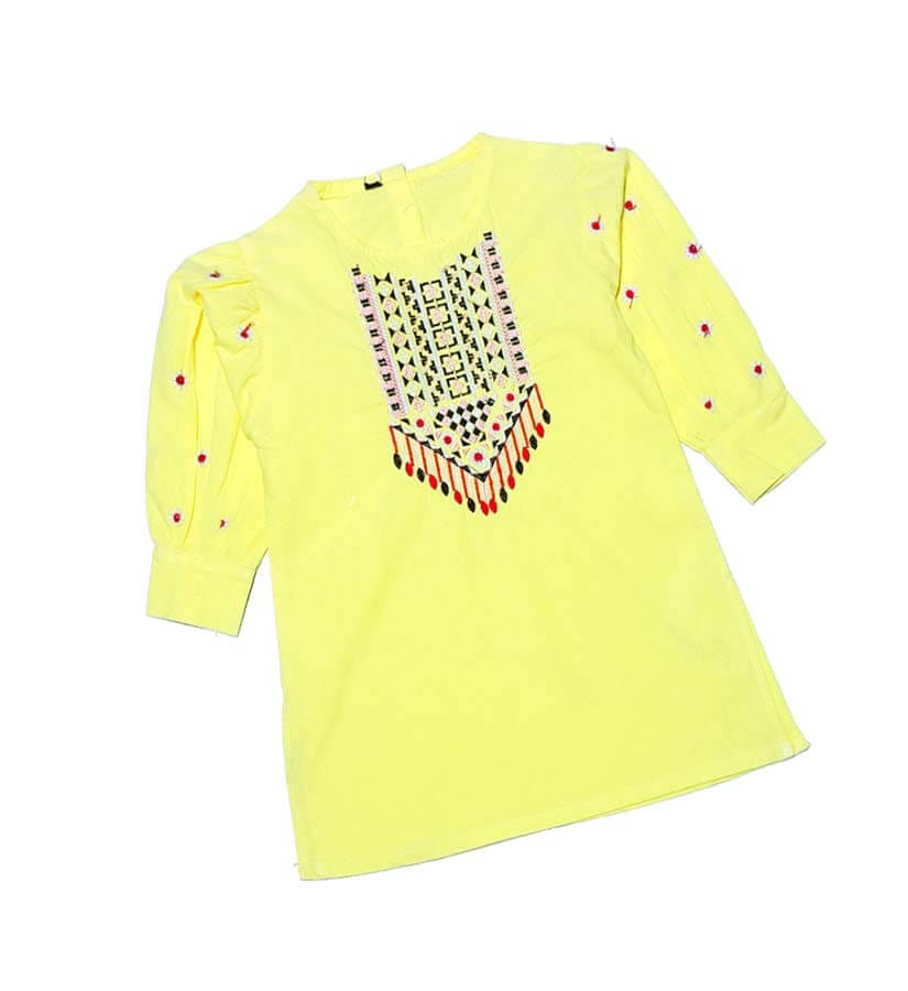Unique Embroidary Gather Sleeves Kurti – Lemon – Cotton