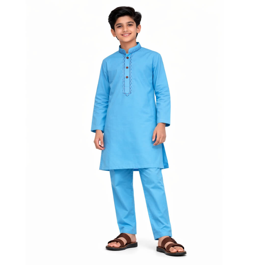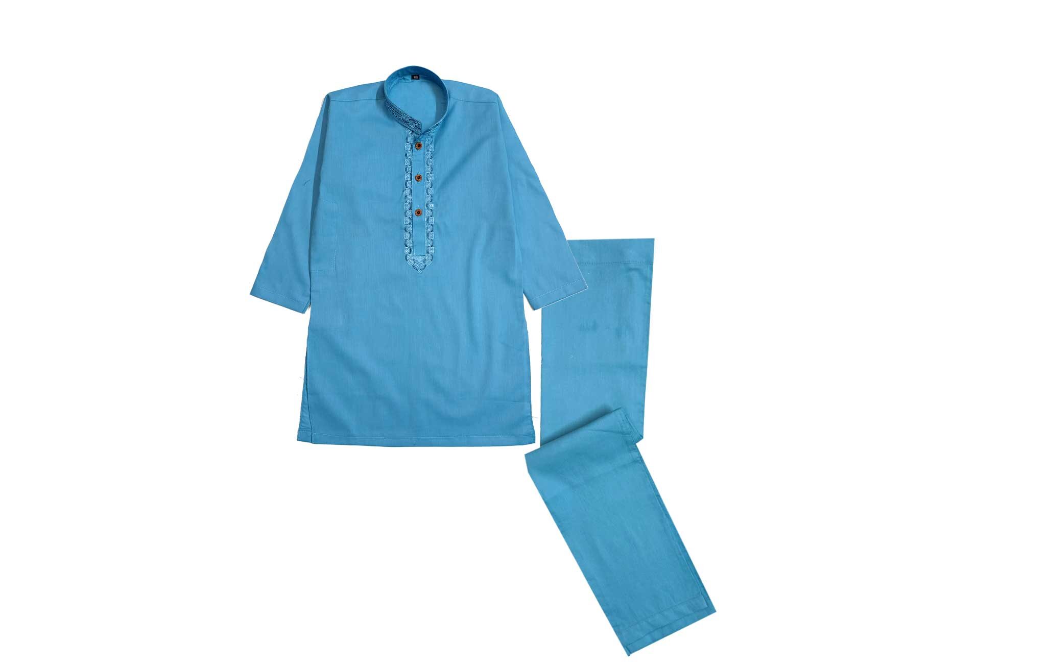 This is a traditional Shalwar Kameez set in a beautiful emerald frozi color designed for Kids. The set includes a matching shirt (kameez) and trousers (shalwar).